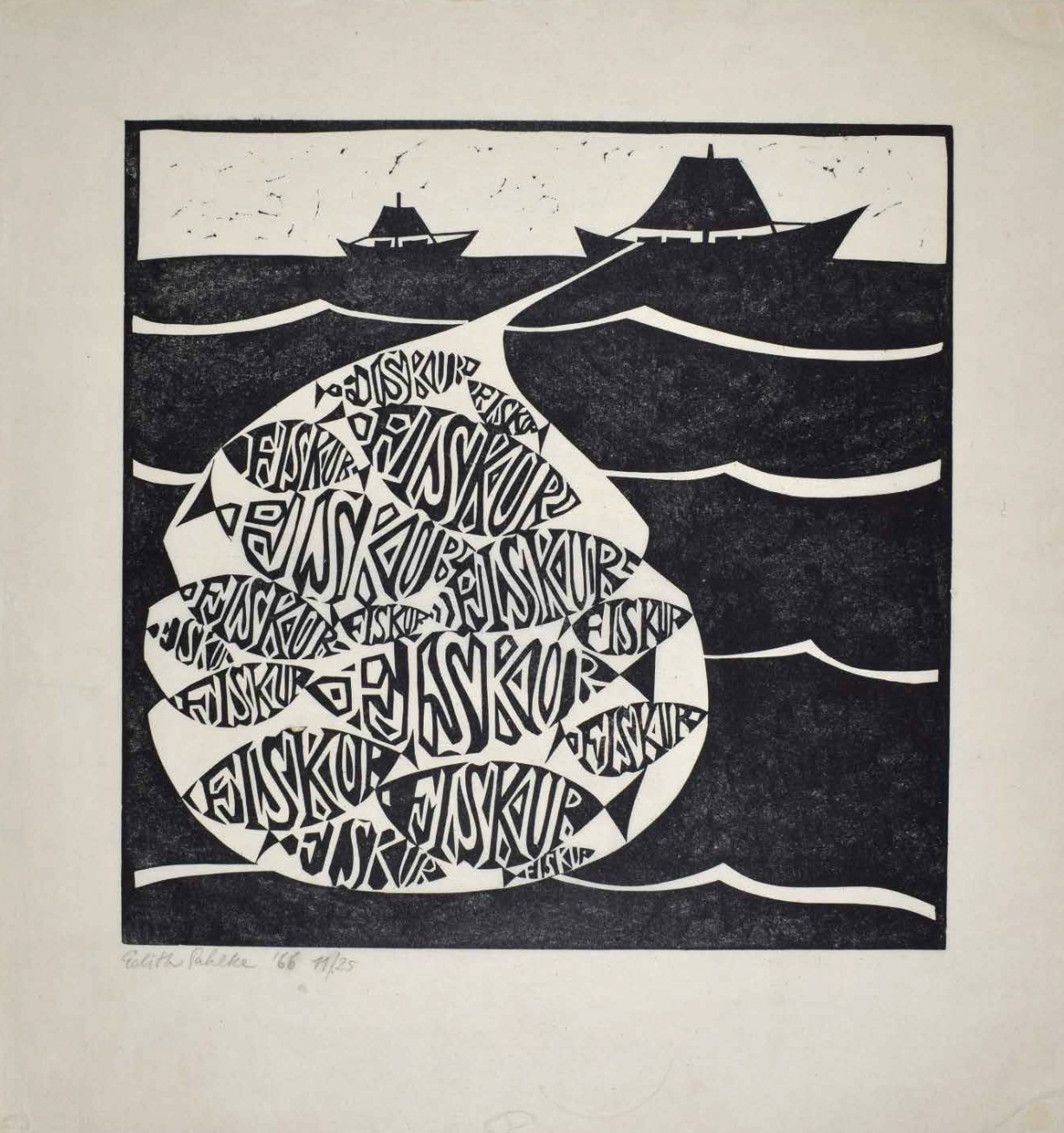 We are pleased to show a selection of linocuts, prints, and graphic projects that focus on the interplay of letters, words, numbers, and images, often presented as haikus and short texts. An intrepid and curious traveller, Pahlke’s multi-lingual prints were executed in German, French, English, and Icelandic.