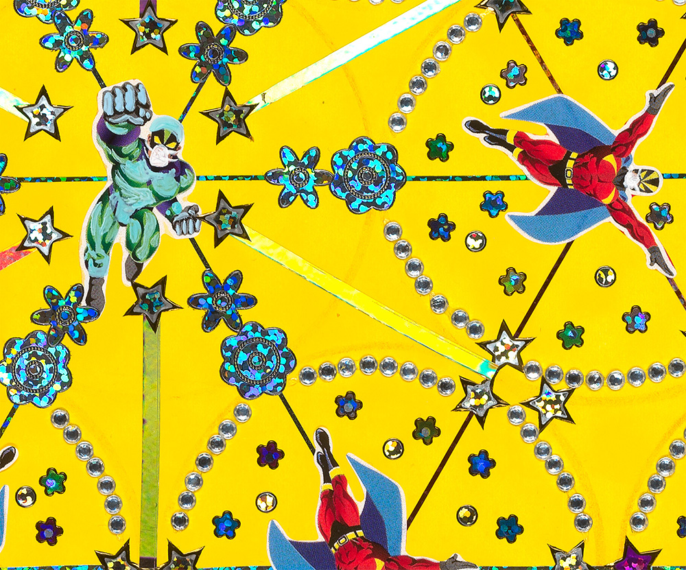 Stickers, sick-on gems and reflective tape on Arches 300gsm watercolour paper